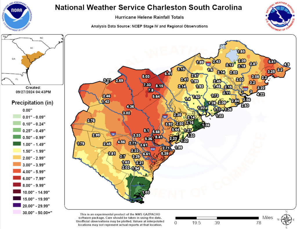 6:01 p.m. EDT – Summary data is beginning to come in from the National Weather Service (NWS). The precipitation accumulation amounts in the Upstate region are stunning.